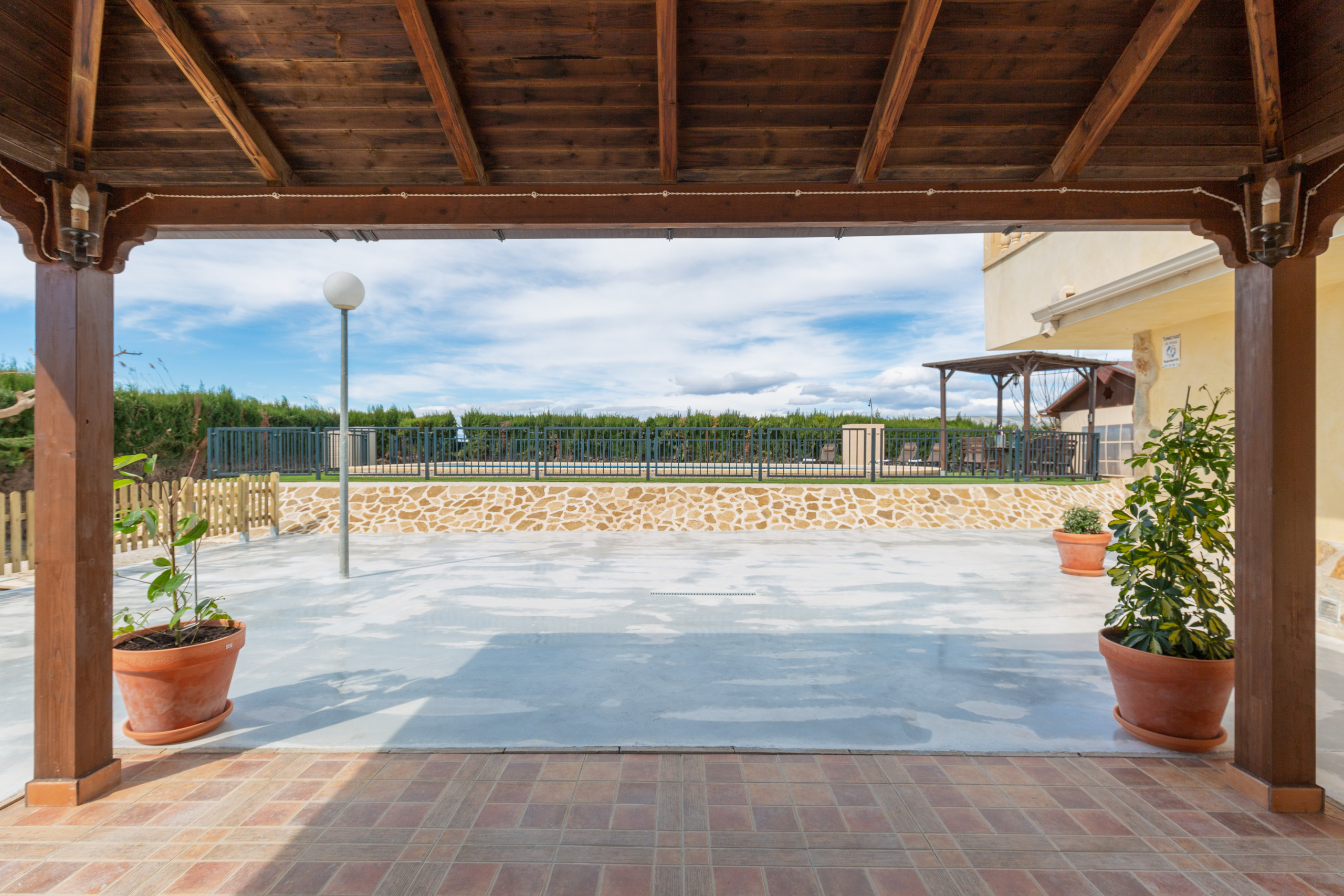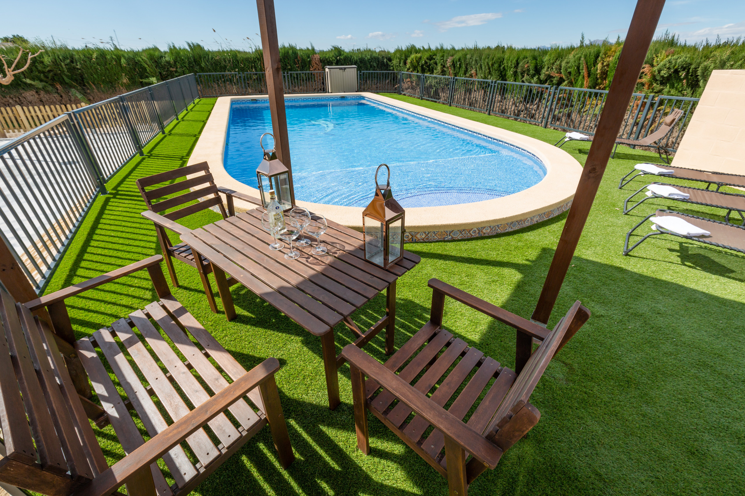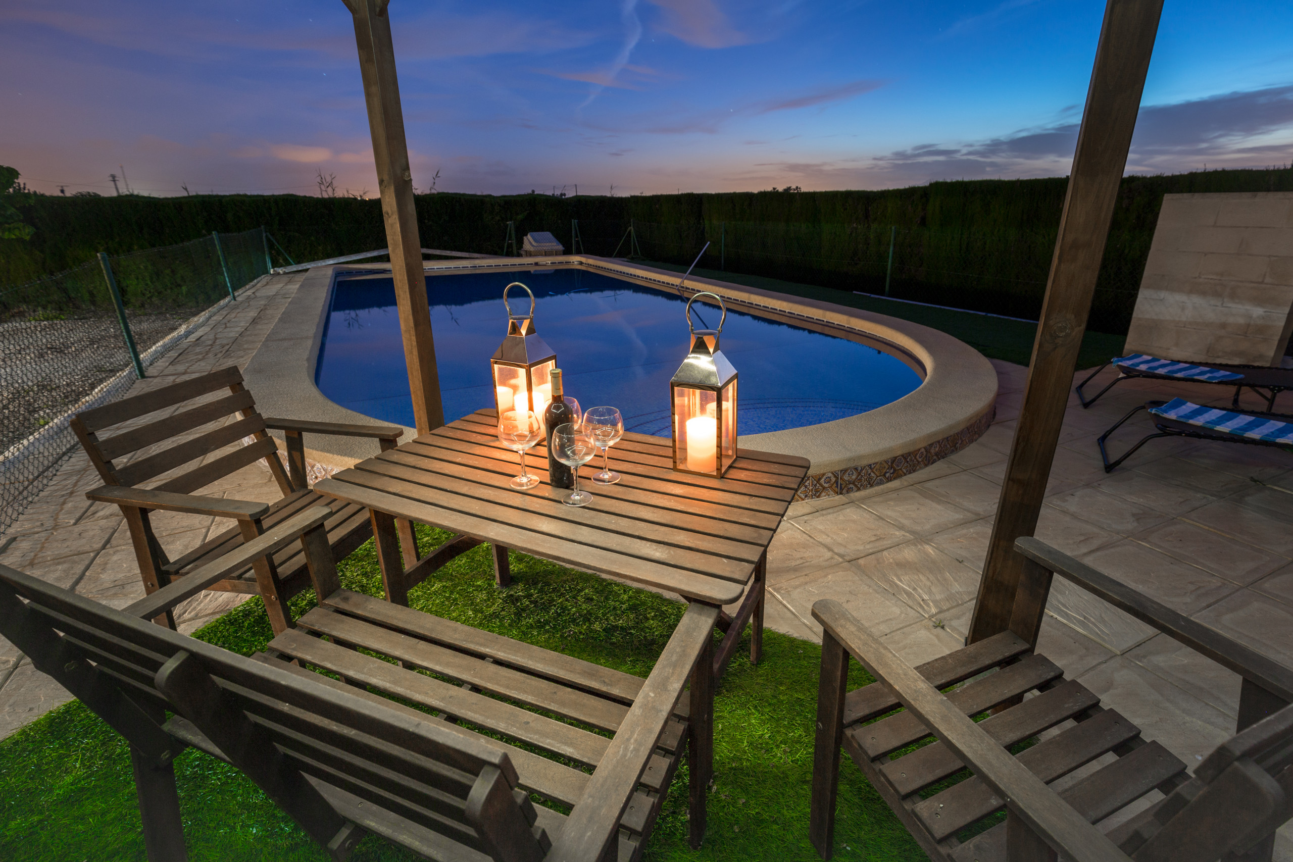 The accommodation is equipped with the following items: garden, garden furniture, fenced garden, 500 m² terrace, barbecue, fireplace, iron, internet (Wi-Fi), balcony, air conditioning (hot/cold), air-conditioned, private swimming pool, garage in the same building, 1 TV.